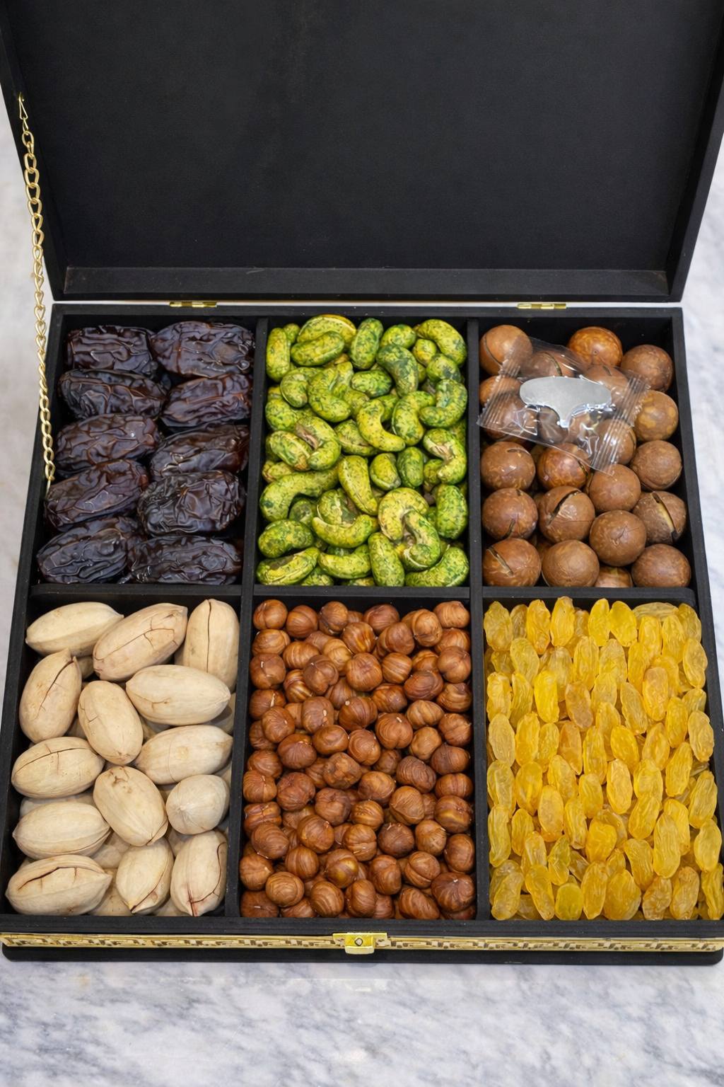 Nafislik va olijanoblikni qadrlovchilar uchun maxsus! Tillarang "Versace" uslubidagi naqshlar bilan bezatilgan qora yog‘ochli (yoki qattiq kartonli) quti ichida dunyoning eng sara va nodir ne’matlari jamlangan. Bu to‘plam shunchaki sovg‘a emas, bu yuqori darajadagi ehtirom va nozik did belgisidir.