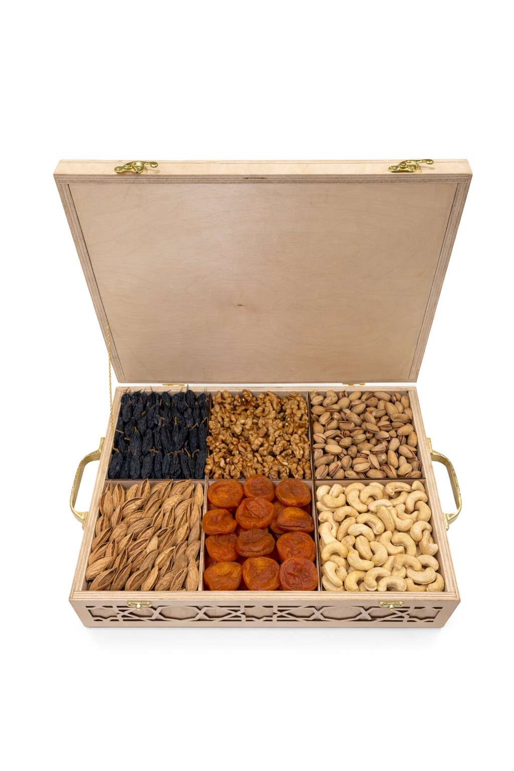 O'zining mustahkam yog'och qadog'i va unga o'yilgan nafis naqshlari bilan ajralib turuvchi ushbu to'plam β haqiqiy milliy ehtirom belgisidir. Qutining yon tomonlaridagi tillarang tutqichlar unga o'zgacha salobat bag'ishlaydi. Ichidagi 6 xil eng sara ne'matlar esa sizning sovg'angizni ham mazali, ham foydali qiladi.