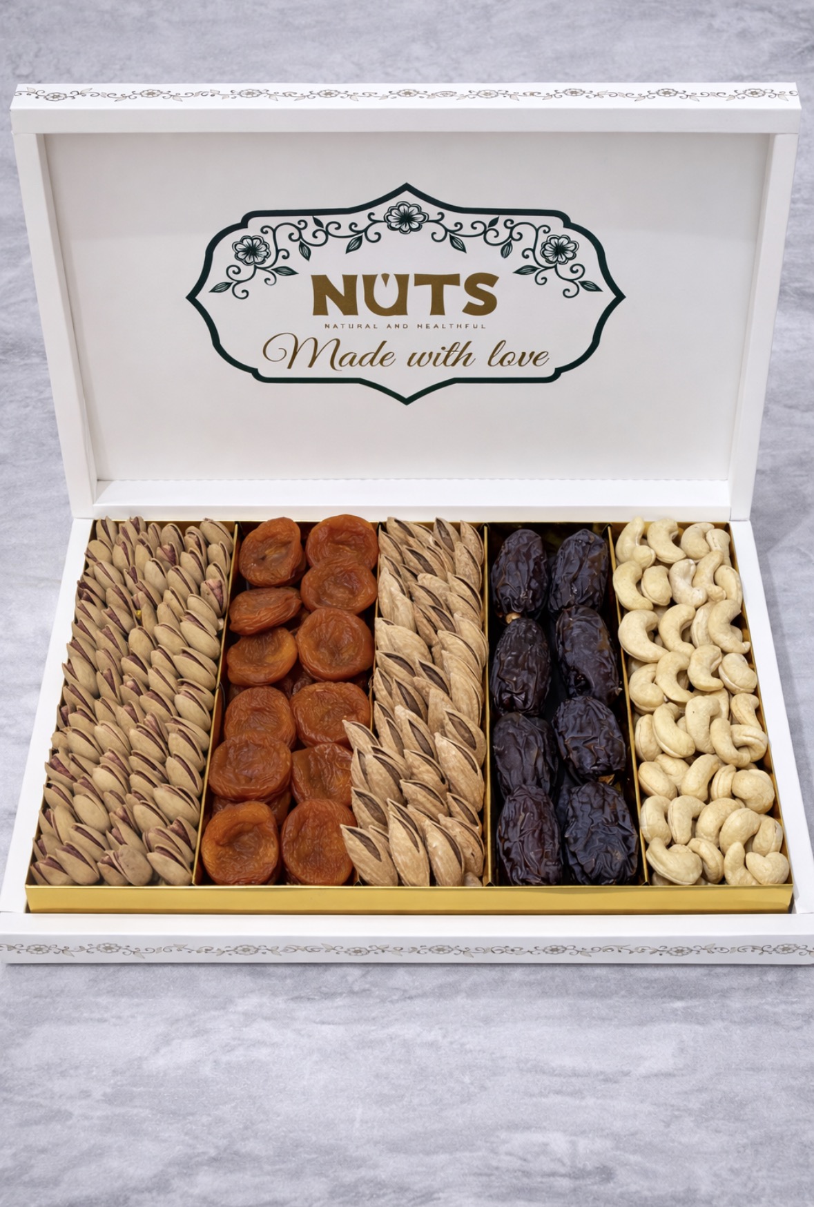 Oq rangli nafis qutiga joylangan premium sovg‘a to‘plami — bu nafaqat lazzat, balki salomatlik va e’tibor ramzidir. "Made with Love" (Mehr bilan tayyorlangan) yozuvi tushirilgan ushbu to‘plam o‘zining estetik ko‘rinishi va saralangan tarkibi bilan ajralib turadi.