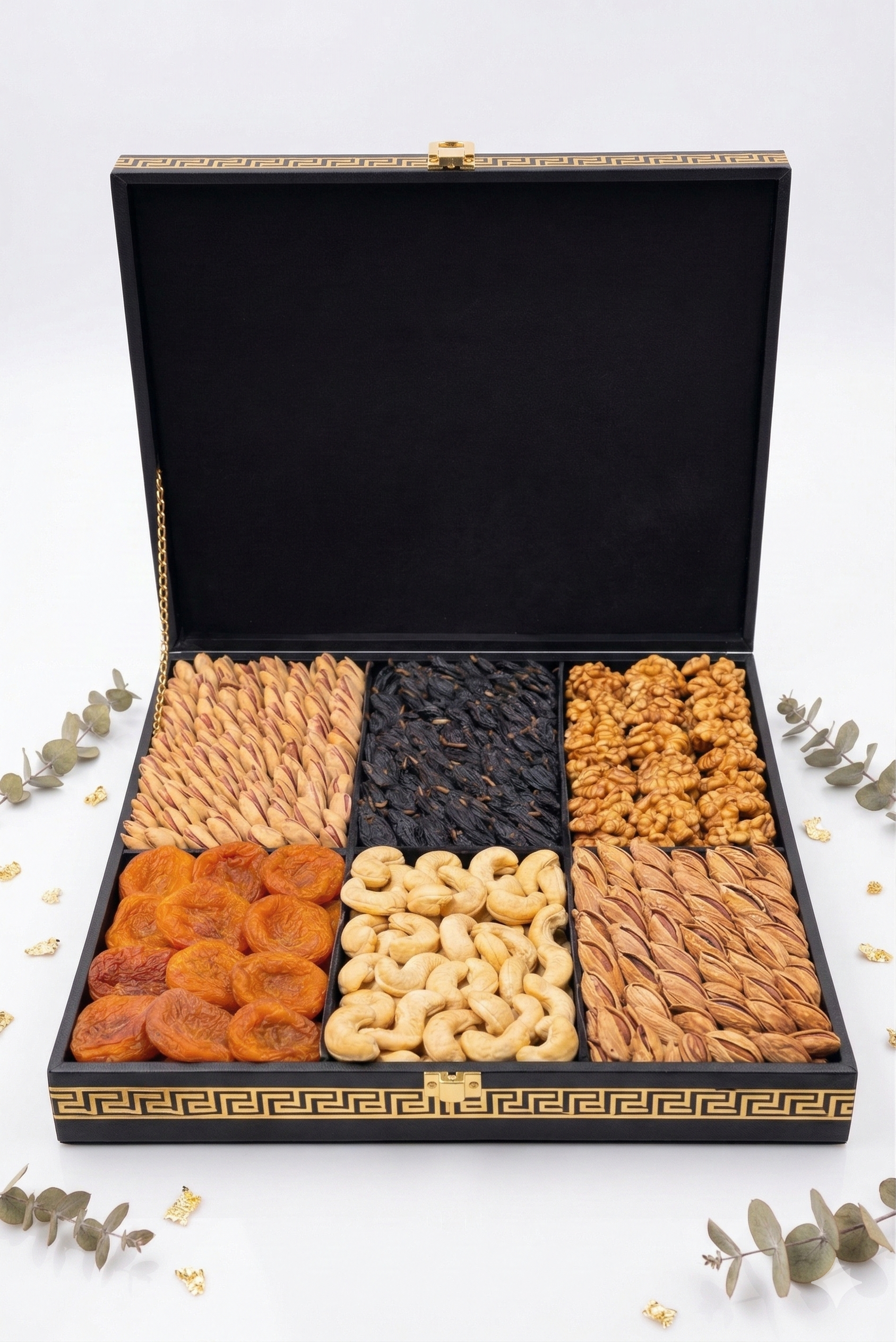 Ushbu to‘plam — nafosat va olijanoblik timsolidir. Tillarang "Versace" uslubidagi naqshlar bilan bezatilgan qora velvet quti ichida tabiatning eng nodir va saralangan ne’matlari joy olgan. Bu shunchaki sovg‘a emas, bu yuqori darajadagi ehtirom va did belgisidir.