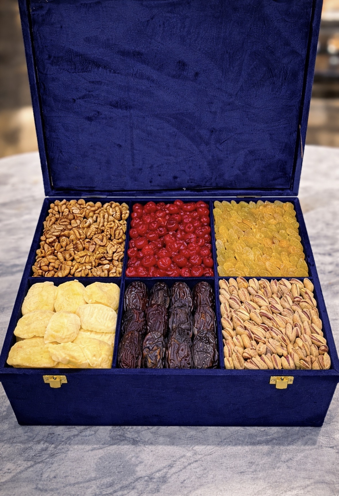 Agar siz eng aziz insoningizni hayron qoldirmoqchi bo‘lsangiz, ushbu to‘plam aynan siz uchun. Ushbu ulkan sovg‘a to‘plami — haqiqiy saxiylik va olijanoblik namunasidir. To‘q ko‘k (dark blue) rangli, nafis velvet matosi bilan qoplangan ushbu quti ichida olti xil eng saralangan, yirik va shirin ne’matlar joy olgan. Bu to‘plam o‘zining hajmi va boy tarkibi bilan har qanday insonni hayratda qoldira oladi.