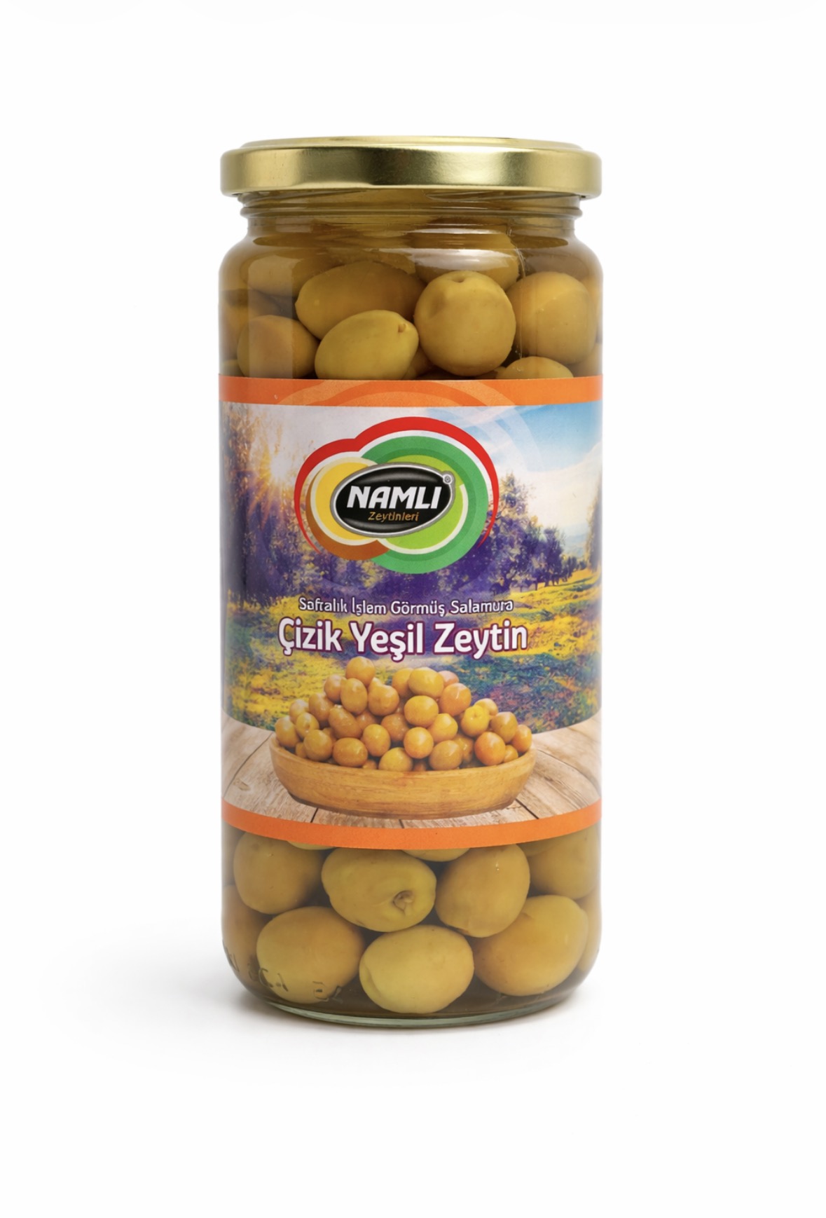 Turkiyaning eng sara bog‘laridan yig‘ilgan "Namlı" yashil zaytunlari. "Çizik" (chizilgan) usuli — bu zaytun mevalari po‘stlog‘ini ehtiyotkorlik bilan chizish orqali ularning tabiiy nordonligini va marinad ta’mini ichkariga singdirishning klassik yo‘lidir. Bu zaytunlar o‘zining qarsildoq teksturasi va tetiklashtiruvchi ta’mi bilan ajralib turadi.